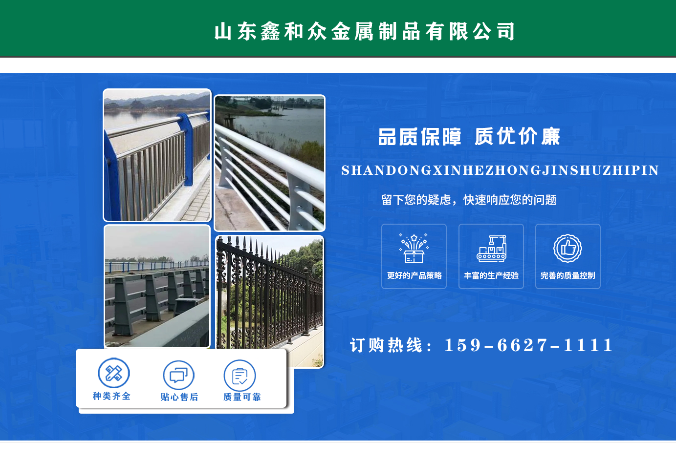山東鑫和眾金屬制品有限公司主要產(chǎn)品有防撞護欄,橋梁護欄,道路護欄,河道護欄,不銹鋼護欄等護欄。提供設計方案,一站式定制,包您滿意價格優(yōu)惠,歡迎來電咨詢! 公司常年從事銷售護欄防撞護欄,橋梁護欄,道路護欄,河道護欄,不銹鋼護欄,橋梁鋼護欄,河道燈光護欄等。產(chǎn)品廣泛應用于橋梁、河道、旅游景區(qū)、道路、公路、公園、小區(qū)、景觀、道路防撞等領域。 公司產(chǎn)品均采用優(yōu)質(zhì)不銹鋼材料,符合相關標準。各種型號不銹鋼復合管及護欄,質(zhì)量嚴格把控。產(chǎn)品強度高、耐腐蝕、焊接牢固、抗沖擊、性能好,防撞護欄結構簡單、美觀實用大方。 歡迎前來訂購!...
